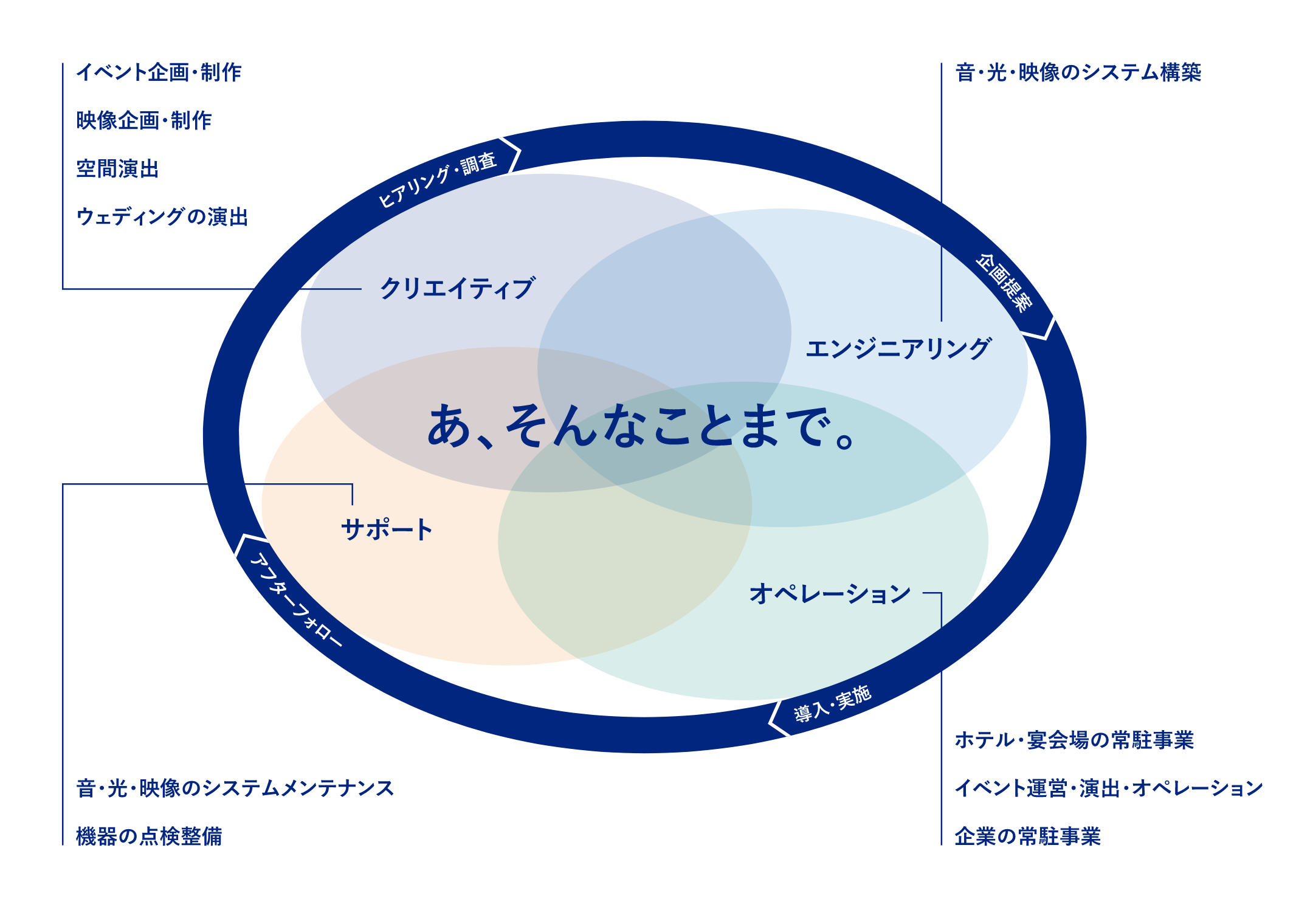 電音エンジニアリングが展開している事業は、「エンジニアリング」「オペレーション」「サポート」「クリエイティブ」という4つのカテゴリーで分けられます。事業の幅の広さと同時に、事業同士が連携できるので、1社で全てを引き受けることができるのが最大の強みです。また「ヒアリング・調査」「企画提案」「導入・実施」「アフターフォロー」というトータルサービスを展開することで、「あ、そんなことまで。」と感じるソリューションを提案できます。
